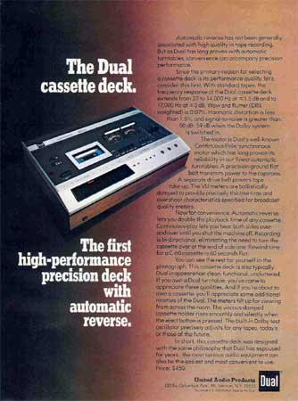 Color magazine ad for the Dual Cassette Deck. Published November 1975. Actual size approximately 8.5 x 11 inches.