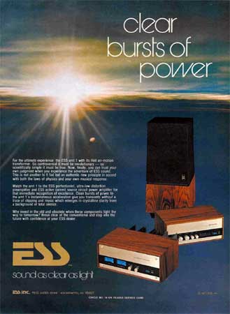 Color magazine ad for the ESS AMT-1. Includes ESS preamp and power amp. Published November 1973.