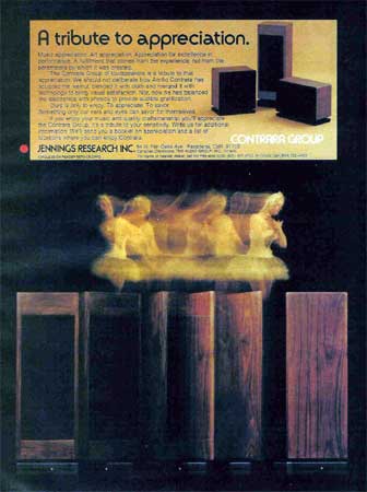 Color ad for Jennings Speakers. Features the Contrara Group. Published October 1975.