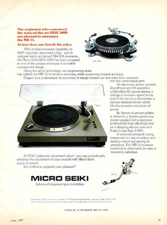 Color magazine ad for the Micro Seiki MB-15. Also mentions the DDX-1000. Published June 1977.