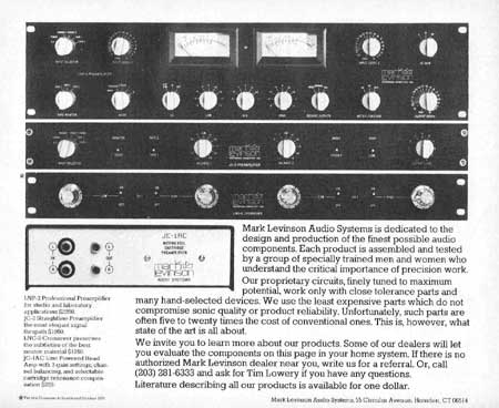 Black and white ad for Mark Levinson components. Includes the LNP-2, JC-2, LNC-2 and JC-1AC.