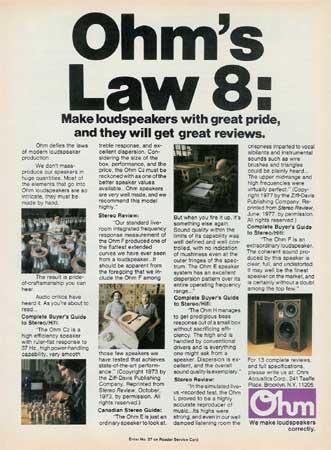 Color magazine ad for Ohm speakers. Mentions the models Ohm C2, Ohm F, Ohm E, Ohm H and Ohm L.