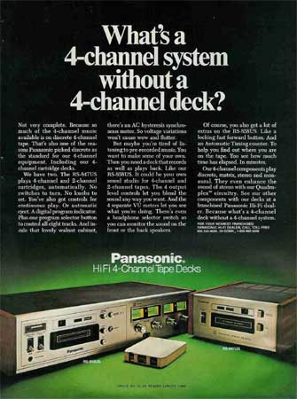 Color magazine ad for the Panasonic RS-858US and RS-847US 8 track decks. Published December 1972.