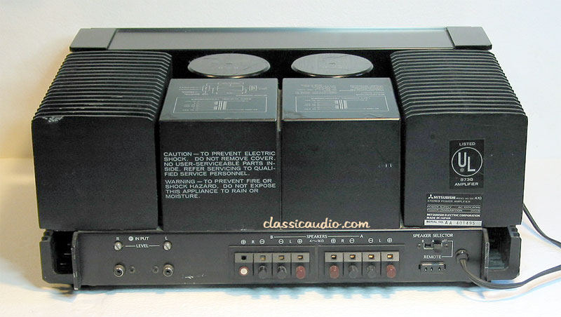 Mitsubishi DA-A10 dual mono block power amplifier in good condition with DA-M10 power level meter. Rated at 100 watts RMS into 8 ohms and 135 watts RMS into 4 ohms. It has been serviced and aligned. Includes copies of the owner's manuals and our original Performance Verification Report. This amplifer features outstanding performance. There are some scratches on the top, and one of the speaker connectors for the "B" set is broken. Please see pictures below.