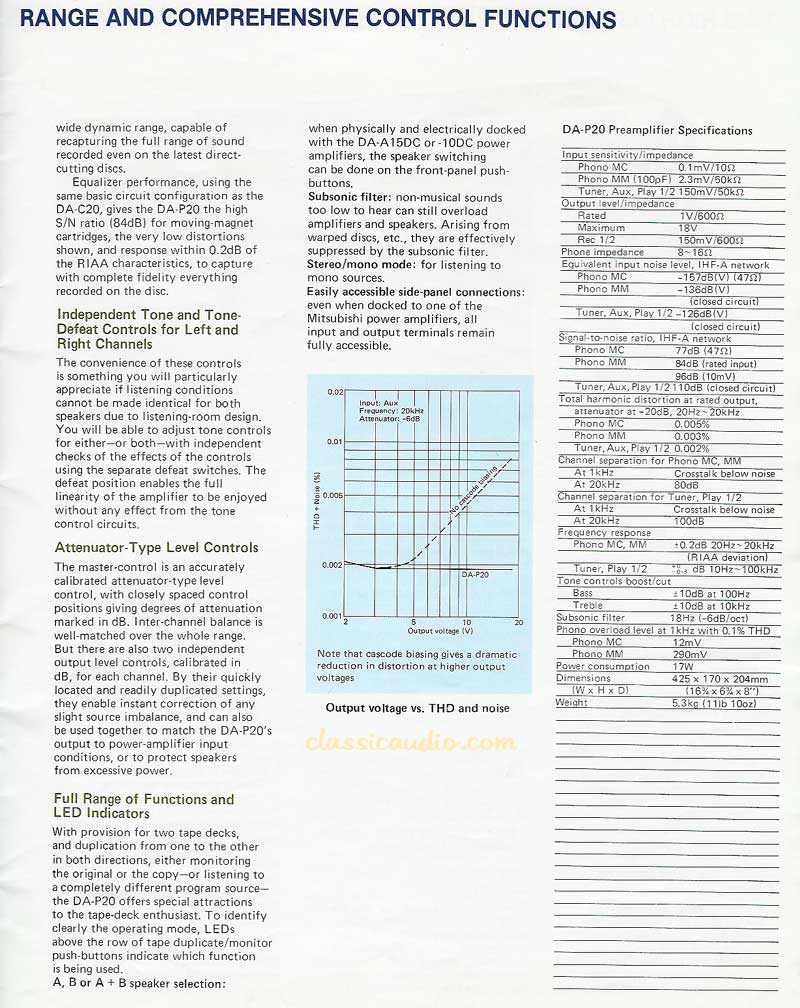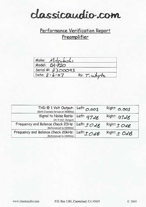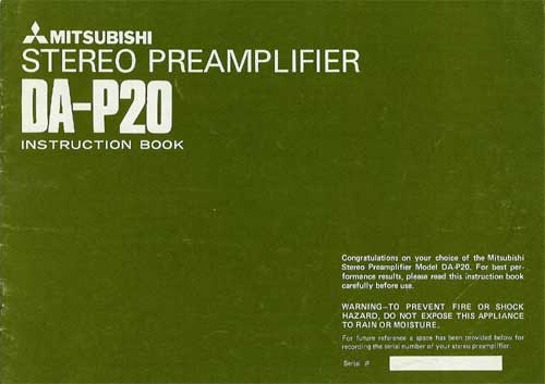 Mitsubishi DA-P20 preamplifier in very good condition. Use as a high quality stand alone preamp with MC phono input or, you can mate it with the Mitsubishi DA-A10 amplifier as shown here. It has been serviced and aligned. Includes a copy of the owner's manual and our original Performance Verification Report. Note that the speaker selector function only works with the Mitsubishi amplifier.