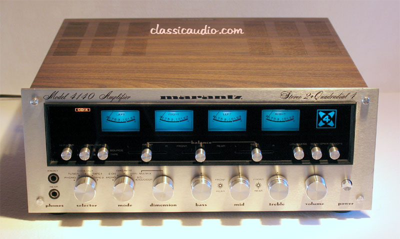 Marantz model 4140 quad integrated amplifier in excellent condition. Includes optional SQA-2B SQ decoder. Rated at 70 watts RMS per channel into 8 ohms in 2 channel mode and 25 watts RMS per channel in 4 channel mode. This unit has been serviced and fully tested. Our original Performance Verification Report, and copy of the owner's manual are included.