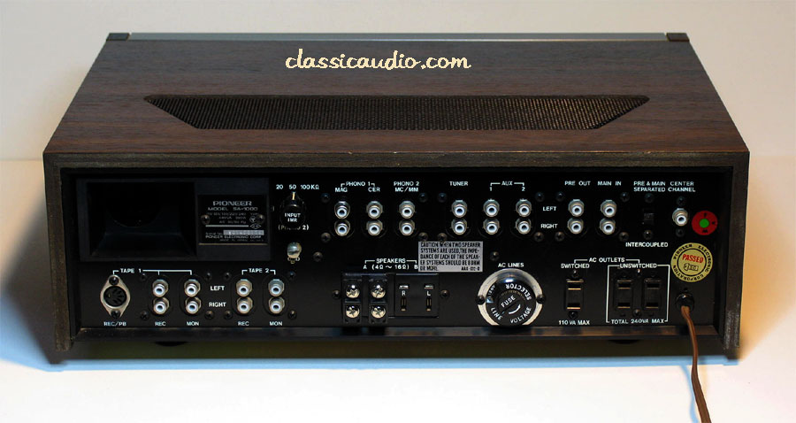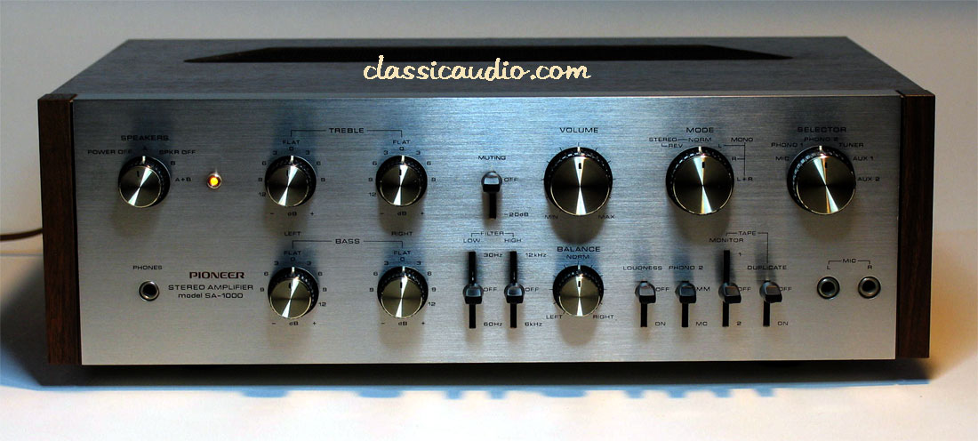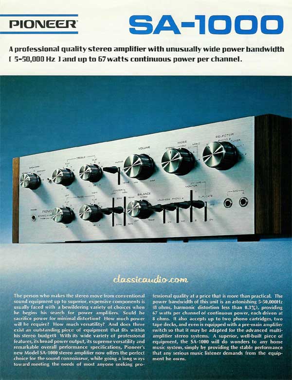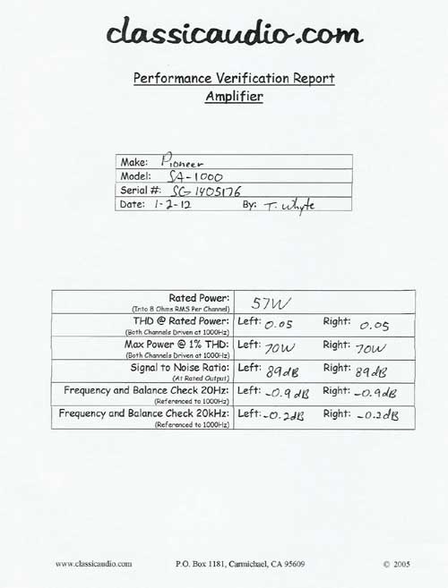 Pioneer model SA-1000 integrated amplifier in immaculate condition. Rated at 57 watts RMS into 8 ohms and 82 watts RMS into 4 ohms. Built like a tank and loaded with features. This unit has been serviced and fully tested. Our original Performance Verification Report , a copy of the owner's manual, six page product brochure and the original factory test data are all included.