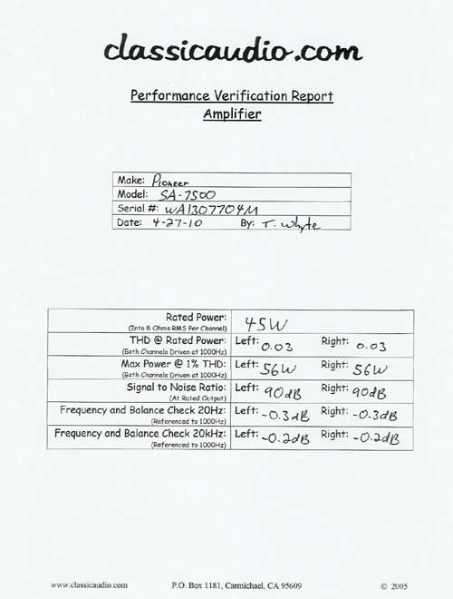 Pioneer model SA-7500 integrated amplifier in very good condition. Rated at 45 watts RMS into 8 ohms and will drive 4 ohms loads. This unit has been serviced and fully tested. Our original Performance Verification Report included. There are a few nicks on the sides of the faceplate, and a few light scratches on the top cover. Please see pictures below.