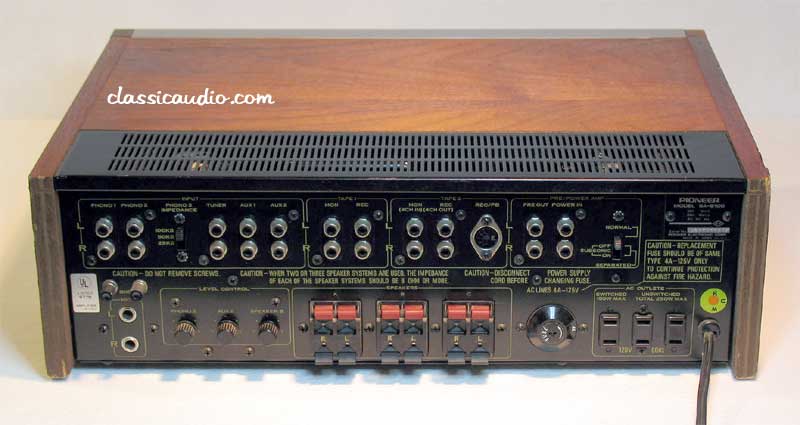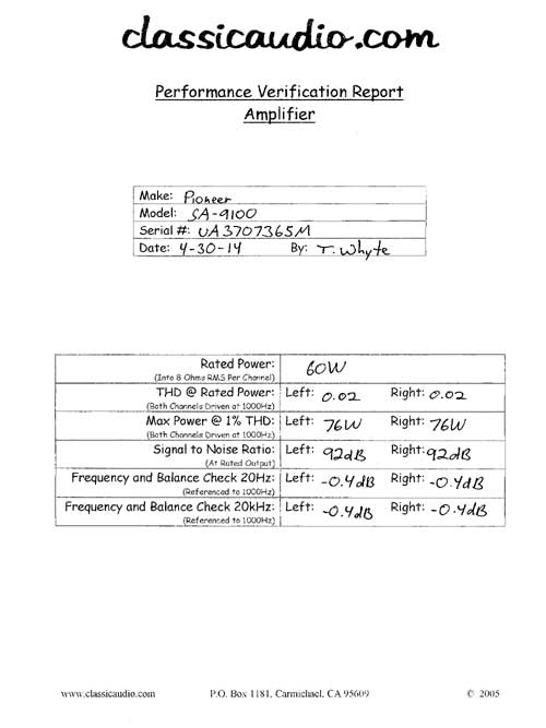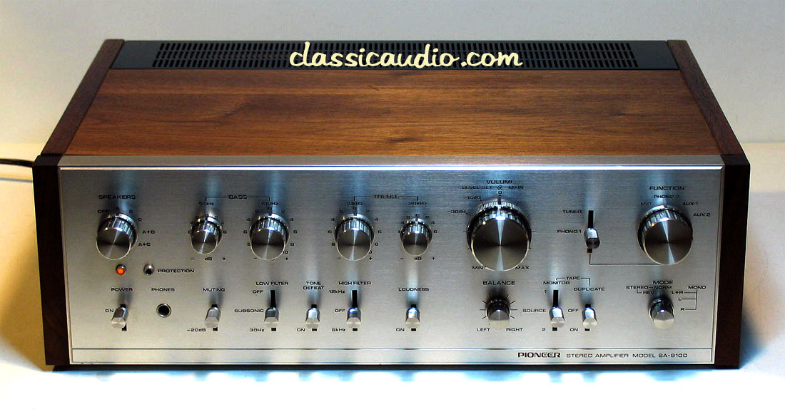Pioneer model SA-9100 integrated amplifier in very good condition. Rated at 60 watts RMS into 8 ohms and 75 watts RMS into 4 ohms. Built like a tank and loaded with features. One very unique feature is a level trim control for the B set of speakers. This unit has been serviced and fully tested. Our original Performance Verification Report and a copy of the owner's manual included. There is minor damage to the left rear of the cabinet. Please see pictures below.