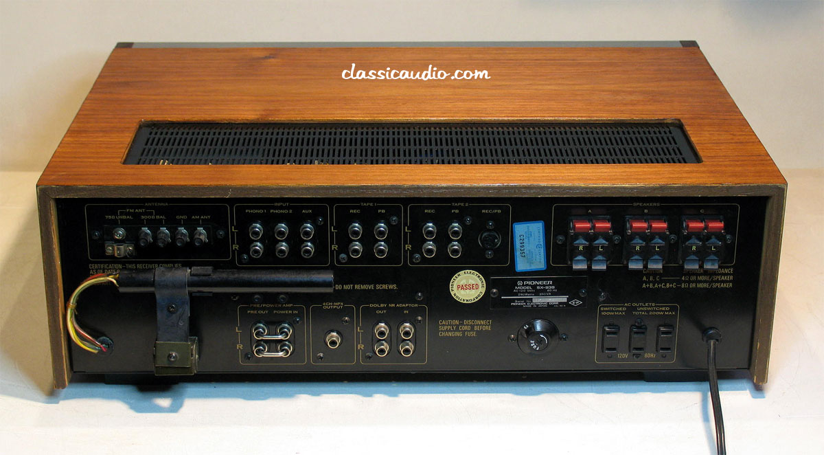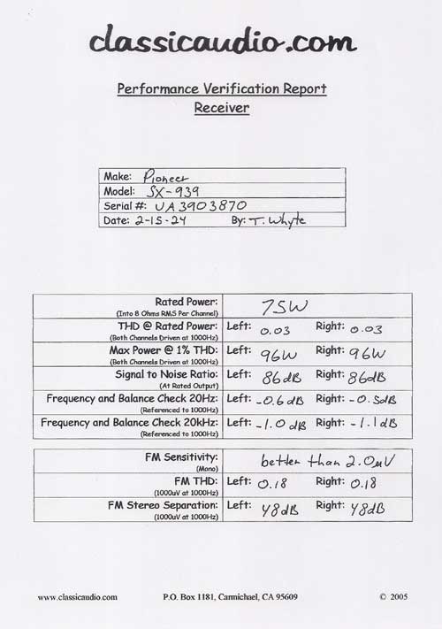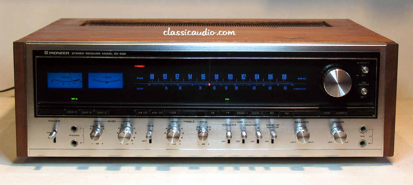 Pioneer model SX-939 AM/FM Receiver in excellent condition. Rated at 75 watts RMS per channel into 8 ohms and 100 watts RMS per channel into 4 ohms. It has been serviced and fully tested. Includes our original Performance Verification Report.