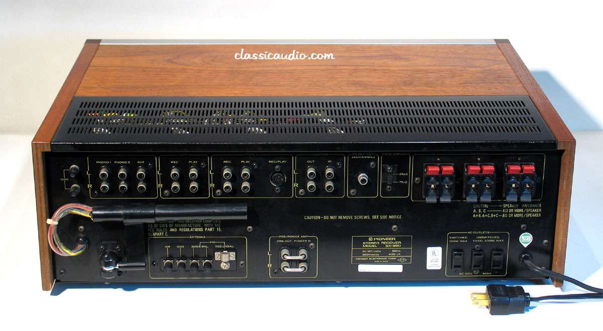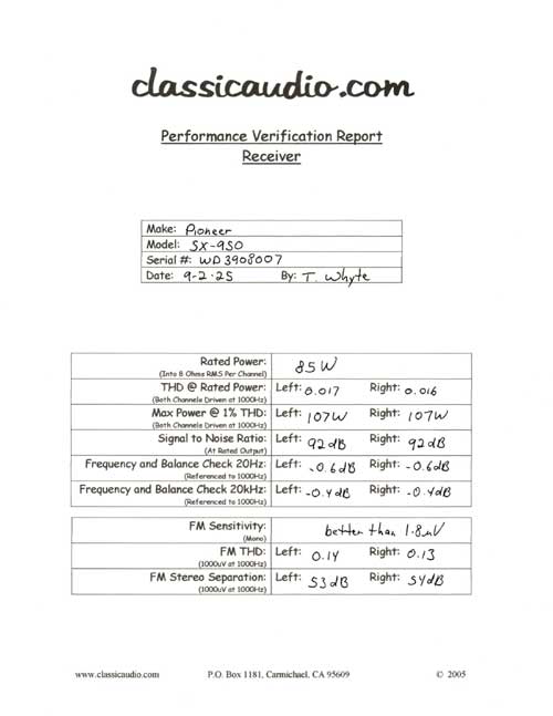 Pioneer model SX-950 AM/FM receiver from April of 1977 in excellent condition. Rated at 85 watts RMS per channel into 8 ohms and 110 watts RMS into 4 ohms. It has been serviced and fully tested. Includes our original Performance Verification Report.
