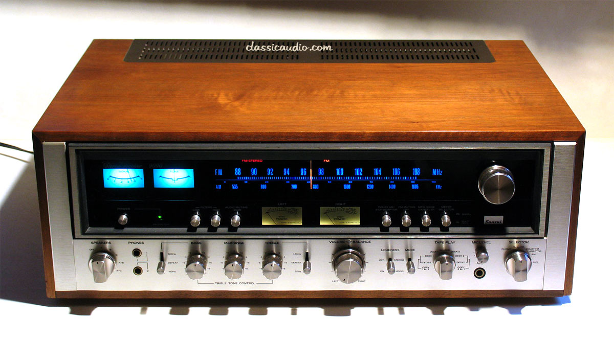 The Sansui 9090 is a high output version of the 8080 stereo receiver with 110 watts continuous, per channel (minimum RMS) at 1000Hz both channels driven into 8 ohms, with no more than 0.2 % distortion.