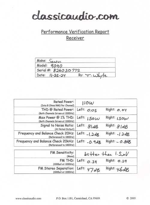 Sansui model 9090 AM/FM Stereo receiver in immaculate condition. All lettering is perfect. Acquired from the original owner. Rated at 110 watts RMS per channel into 8 ohms. It has been serviced and aligned. Includes our original Performance Verification Report.