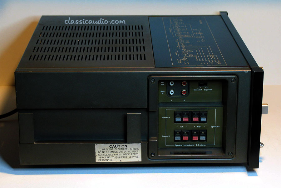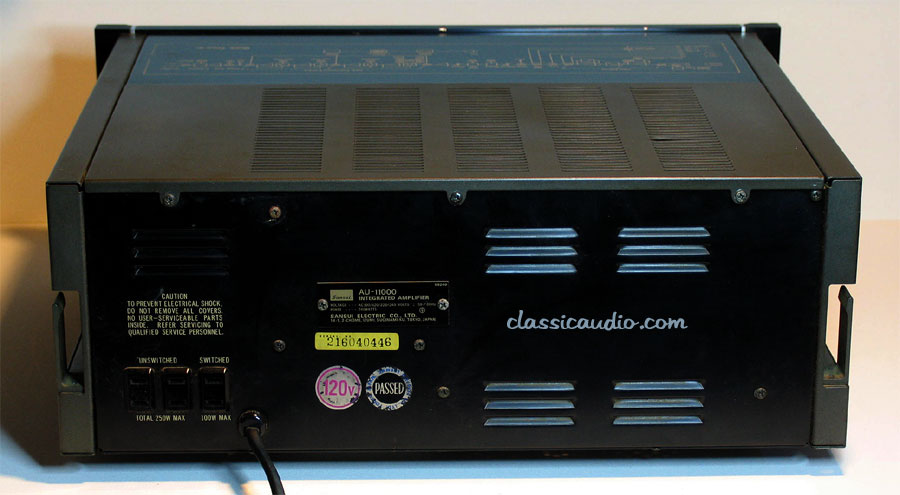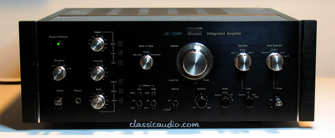 The Sansui model AU-11000 is rated at 110 watts RMS per channel into 8 or 4 ohms. It features dual phono inputs, one with adjustable loading. Side I/O locations make for easy cable management. This monster will do 100 mph all day long.