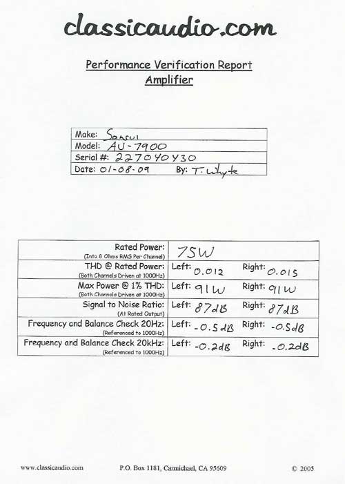 Sansui model AU-7900 integrated amplifier in excellent condition. It has been serviced and fully tested. Included is a copy of our original Performance Verification Report .