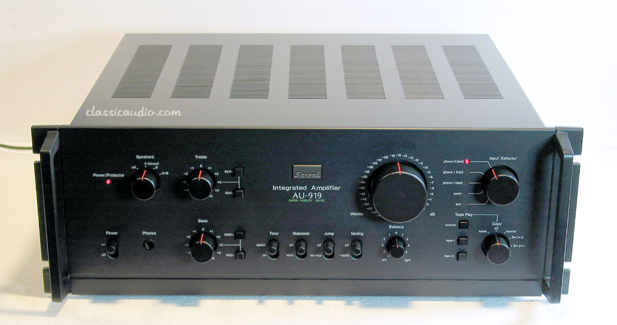 Sansui model AU-919 integrated amplifier in immaculate condition with optional rack mount handles. Rated at 110 watts RMS per channel into 8 ohms. Features outstanding performance and an MC phono input. This unit has been serviced and fully tested. Our original Performance Verification Report and a copy of the owner's manual included.