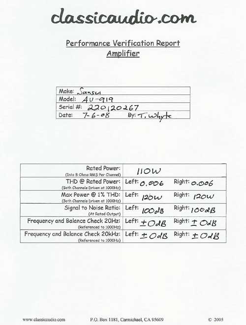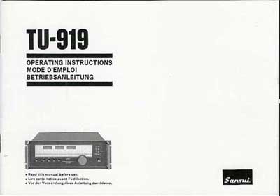 Sansui model TU-919 AM/FM Stereo tuner in immaculate condition with optional rack mount handles. One of Sansui's flagship tuners. Features very low distortion and high sensitivity. Also features FM narrow band mode for superb selectivity and AM wide band mode for maximum fidelity. This unit has been serviced and fully tested. Our original Performance Verification Report and a copy of the owner's manual included.(Tech's note: the TU-919 is one of the best tuners I have ever tested, maybe even better than the TU-9900. The amp is equally as impressive.)