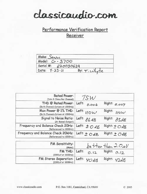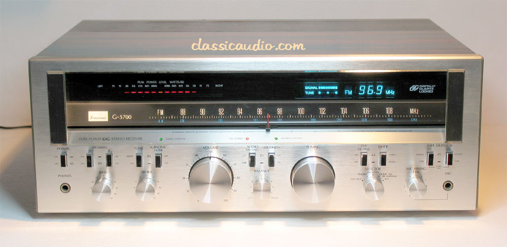 Sansui model G-5700 receiver in very good condition. Rated at 75 watts RMS per channel into 8 or 4 ohms. It has been serviced. Includes our original Performance Verification Report.