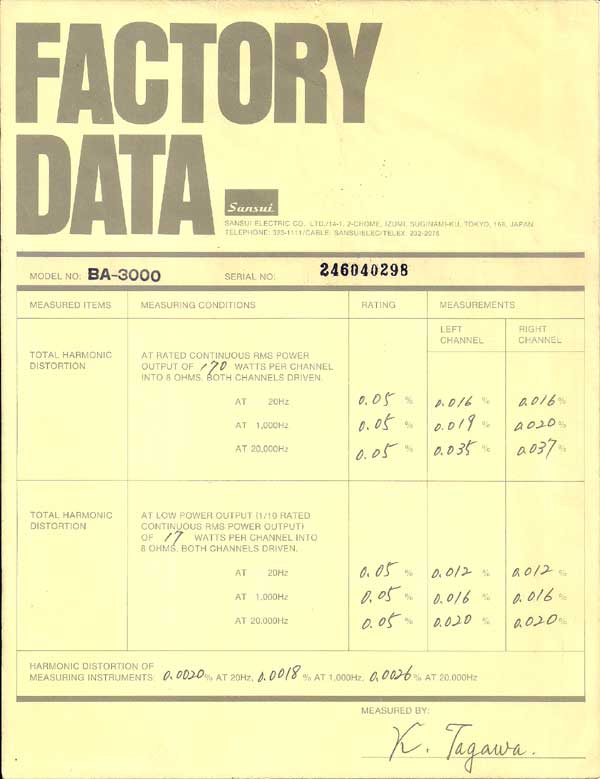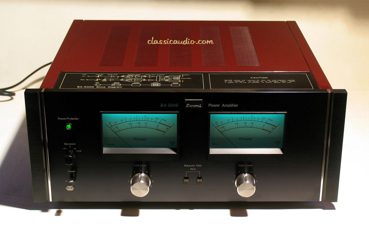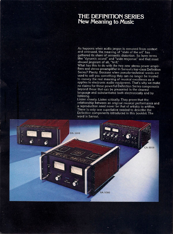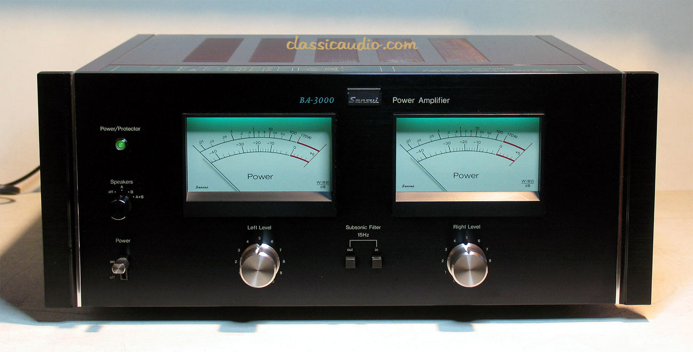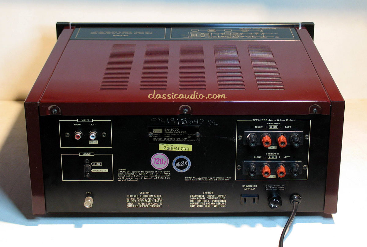 The Sansui BA-3000 has all the design features of the BA-5000, but with a power output of 170 watts per channel, minimum RMS, both channels driven into 8 ohms over a 20 to 20,000Hz bandwidth, with no more than 0.05 % total harmonic distortion; 340 watts, minimum RMS in mono.
