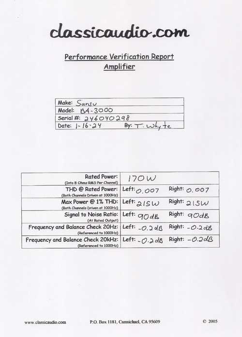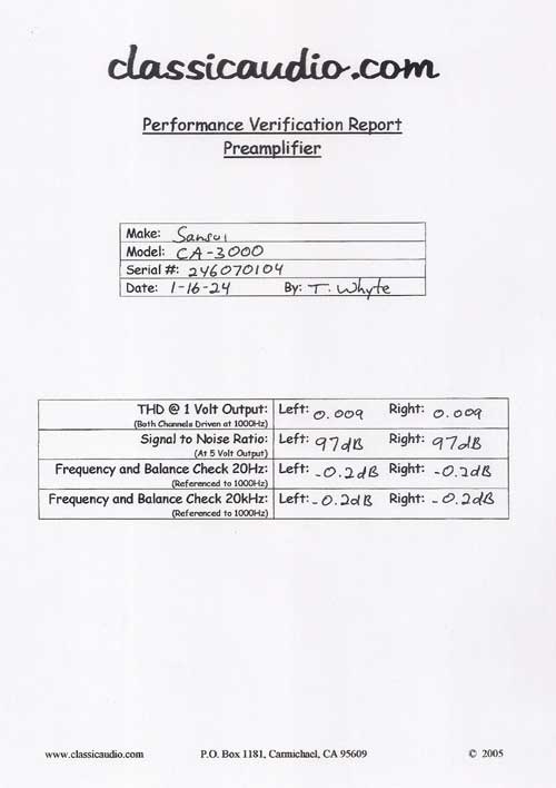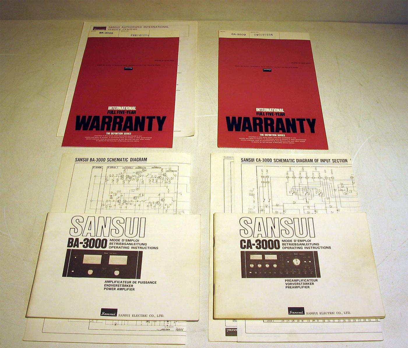 Sansui model TU-9900 AM/FM Stereo tuner, model CA-3000 preamplifier and model BA-3000 power amplifier. All are in excellent condition and all are from the original owner. These units have been serviced and fully tested. Our original Performance Verification Report is provided for each piece.