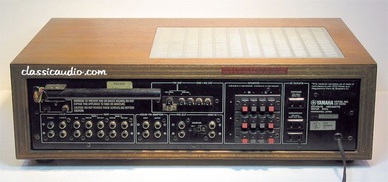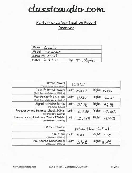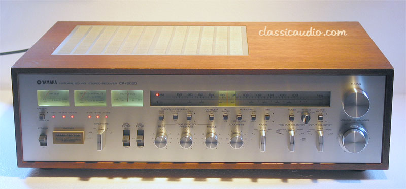 Yamaha model CR-2020 receiver in excellent condition. Rated at 105 watts RMS per channel into 8 ohms. It has been serviced. Includes our original Performance Verification Report, and a copy of the owner's manual. Loaded with features including a built-in MC phono preamp, varaible loudness contour control and power output meters.