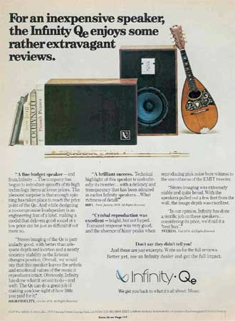 Color magazine ad for the Infinity Qe speakers. Published November 1979. Actual size approximately 8.5 x 11 inches.