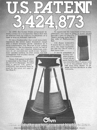 Black and white magazine ad for the Ohm speakers model F.