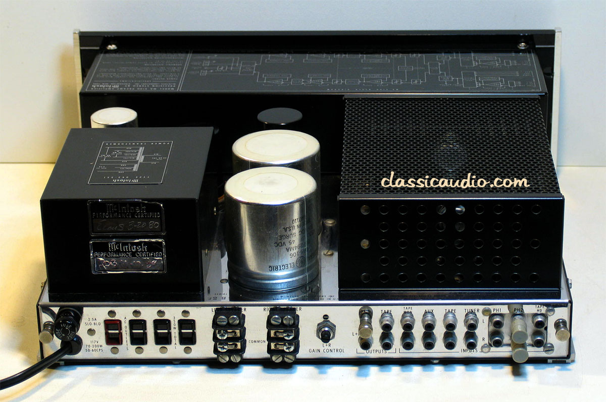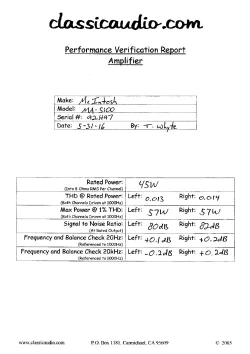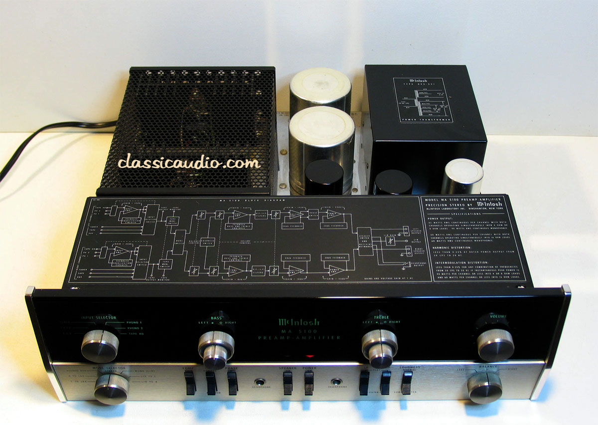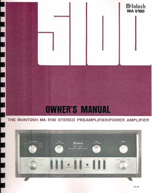McIntosh model MA-5100 preamplifier/power amplifier in excellent condition with optional "slant leg" cabinet. Rated at 45 watts RMS per channel into 4 or 8 ohms. This unit has been serviced and fully tested. Our original Performance Verification Report included as well as a copy of the owner's manual.