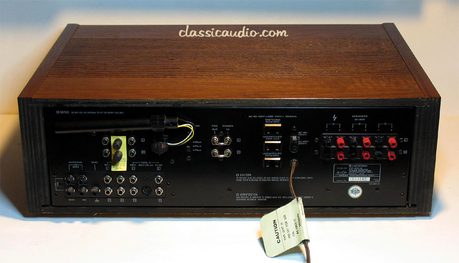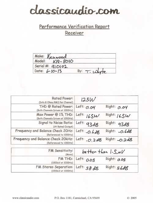 Kenwood model KR-8010 AM/FM Stereo receiver in excellent condition with wood cabinet. Rated at 125 watts RMS per channel into 8 ohms. This unit has been serviced and aligned. Includes our original Performance Verification Report