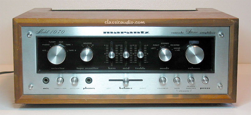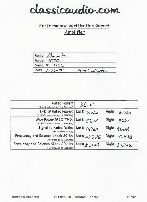 Marantz model 1070 integrated amplifier in excellent condition with optional wood cabinet. Rated at 35 watts RMS per channel into 8 ohms. This unit has been serviced and fully tested. Our original Performance Verification Report included.