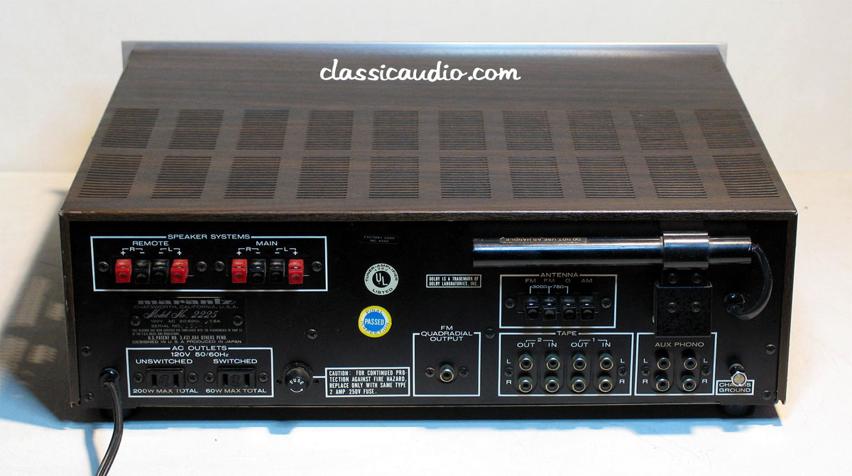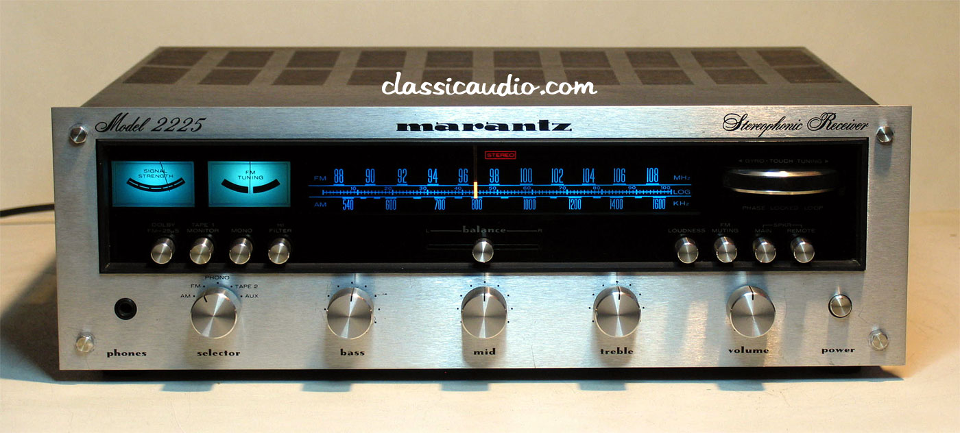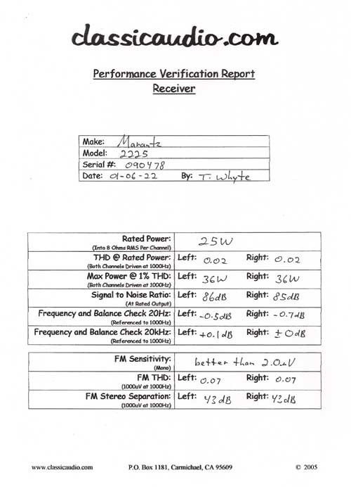 Marantz model 2225 receiver in excellent condition. Rated at 25 watts RMS per channel into 8 ohms. This unit has been serviced and fully tested. Our original Performance Verification Report included. Date of manufacture August 19, 1976.