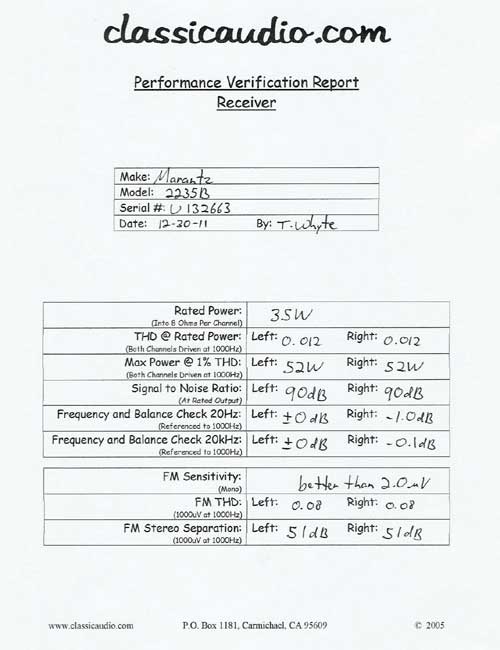 Marantz model 2235 receiver in excellent condition. Rated at 35 watts RMS per channel into 8 ohms. Will also drive 4 ohm loads. Classic "black out" dial styling. This unit has been serviced and fully tested. Our original Performance Verification Report included.