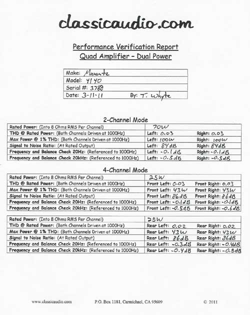 Marantz model 4140 quad integrated amplifier in excellent condition. Includes optional SQA-2B SQ decoder. Rated at 70 watts RMS per channel into 8 ohms in 2 channel mode and 25 watts RMS per channel in 4 channel mode. This unit has been serviced and fully tested. Our original Performance Verification Report, and copy of the owner's manual are included.