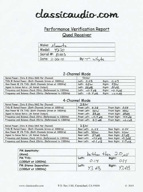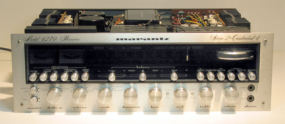 Marantz model 4270 quad reciever in excellent condition with optional wood cabinet in very good condition. Rated at 70 watts RMS per channel in 2-channel mode and 25 watts RMS per channel in 4-channel mode. This unit has been serviced and fully tested. Our original Performance Verification Report and a copy of the owner's manual are included.
