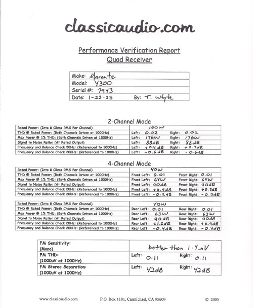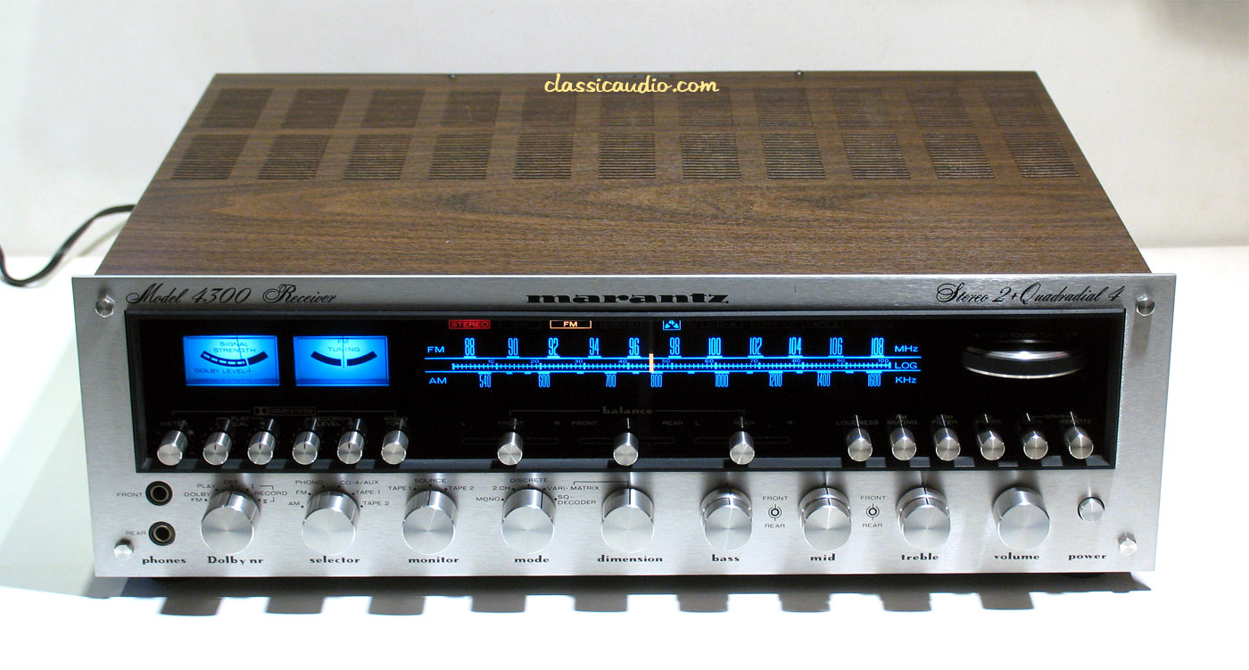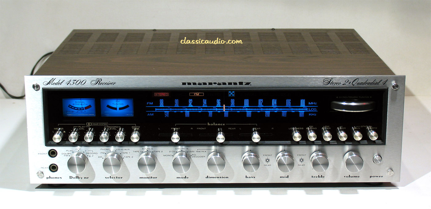 Marantz model 4300 quad receiver in excellent condition. Acquired from the original owner. Rated at 100 watts RMS per channel in 2-channel mode and 40 watts RMS per channel in 4-channel mode into 8 ohms. This unit has been serviced and fully tested. Our original Performance Verification Report included.