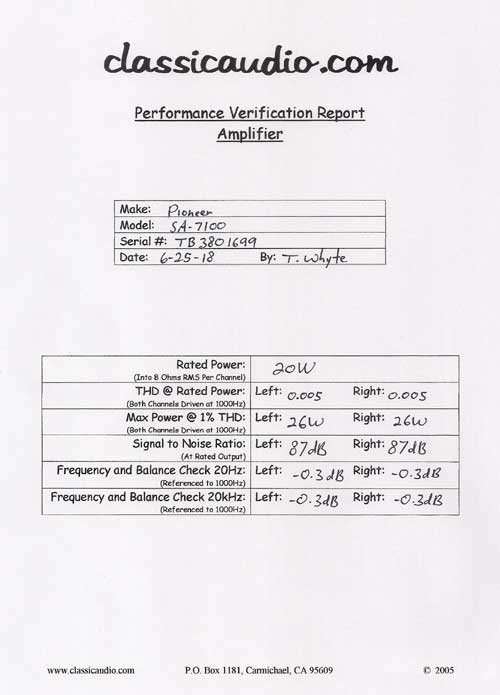 Pioneer model SA-7100 integrated amplifier in excellent condition. Rated at 20 watts RMS into 8 ohms and 24 watts RMS into 4 ohms. Built like a tank and loaded with features. This unit has been serviced and fully tested. Our original Performance Verification Report included.