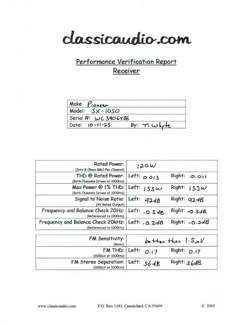 Pioneer SX-1050 receiver in immaculate condition. Rated at 120 watts RMS per channel into 8 ohms and 170 watts RMS into 4 ohms. It has been serviced and fully tested. Includes our original Performance Verification Report and a copy of the owner's manual.