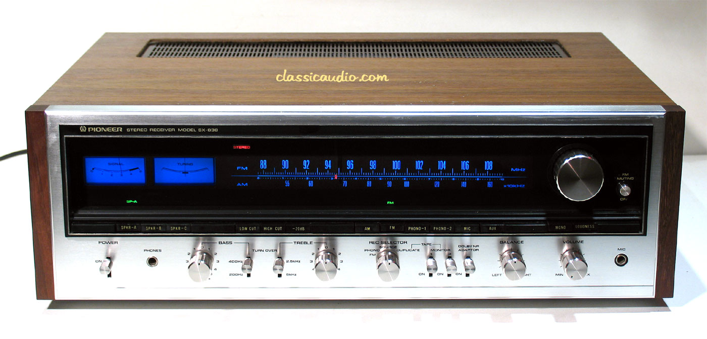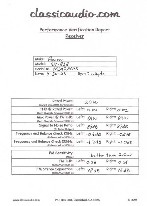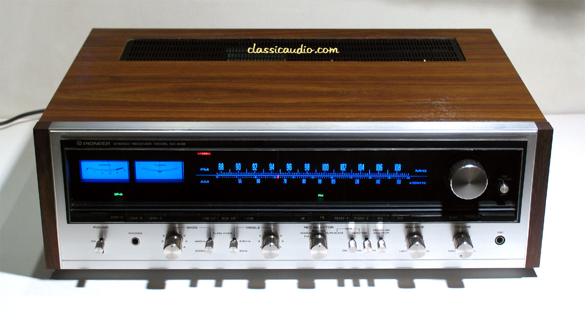 Pioneer model SX-838 AM/FM receiver in excellent condition. Rated at 50 watts RMS per channel into 8 ohms. It has been serviced and fully tested. Includes our original Performance Verification Report.