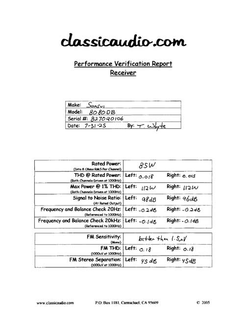 Sansui model 8080DB receiver in excellent condition. All lettering is perfect. Rated at 85 watts RMS per channel into 8 ohms. It has been serviced and aligned. Our original Performance Verification Report included.