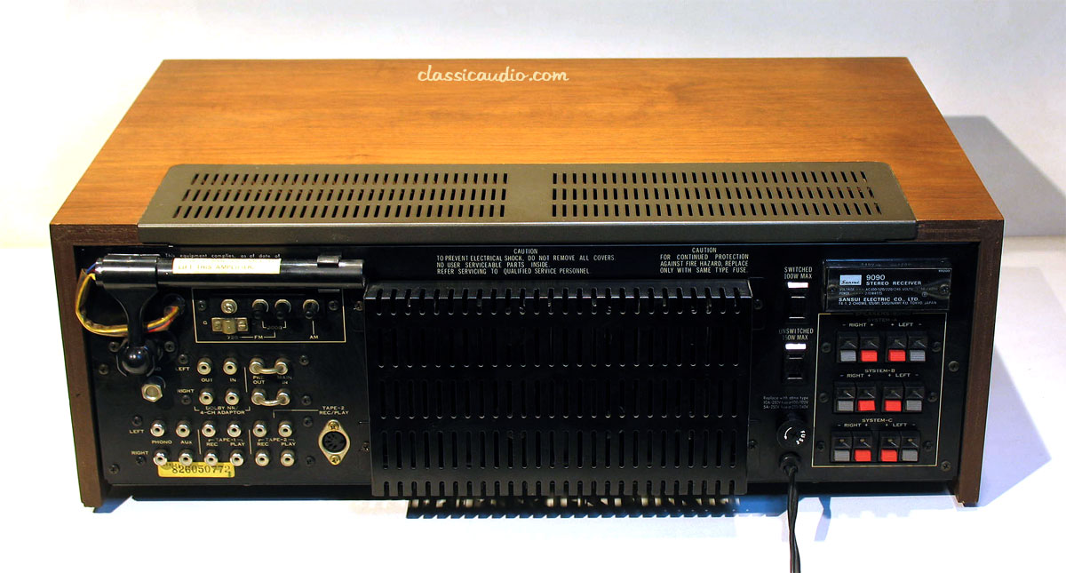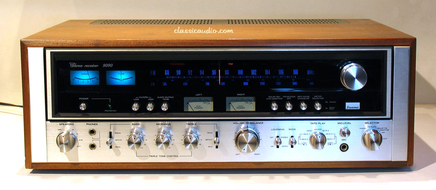 The Sansui 9090 is a high output version of the 8080 stereo receiver with 110 watts continuous, per channel (minimum RMS) at 1000Hz both channels driven into 8 ohms, with no more than 0.2 % distortion.