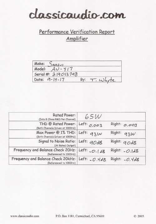 Sansui model AU-417 integrated amplifier in excellent condition. Rated at 65 watts RMS per channel into 8 ohms. Kissin' Cousin to the AU-517, the AU-417 has many of the same features of that model, but with a single common power supply design. This unit has been serviced and fully tested. Our original Performance Verification Report included.