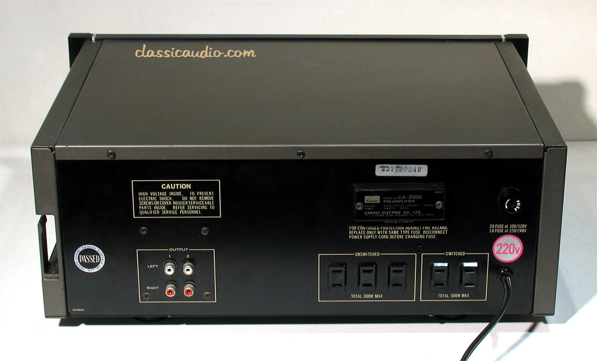 The Sansui model CA-2000 is a full featured high performance control preamplifier. It features dual phono inputs, one with adjustable loading. Side I/O locations make for easy cable management.The Sansui model BA-2000 is rated at 110 watts RMS per channel into 8 or 4 ohms.