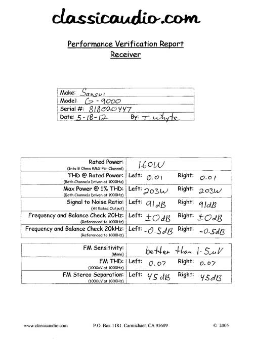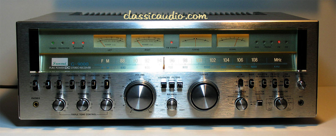 Sansui model G-9000 receiver in very good condition. Rated at 160 watts RMS per channel into 8 ohms. It has been serviced. Includes our original Performance Verification Report.