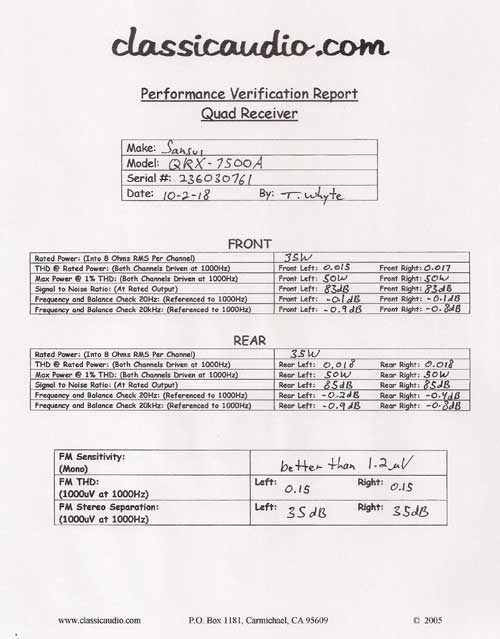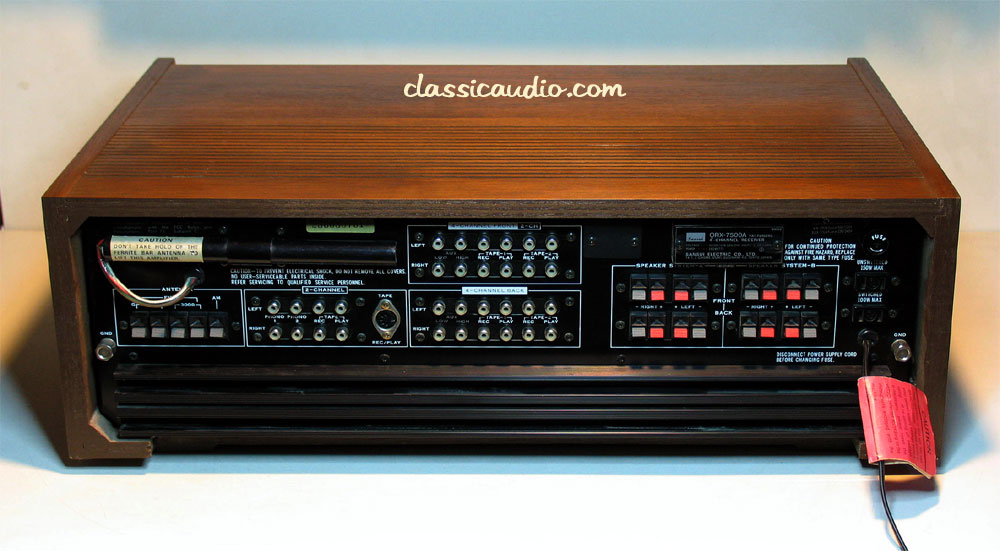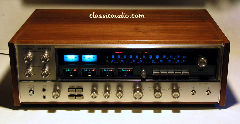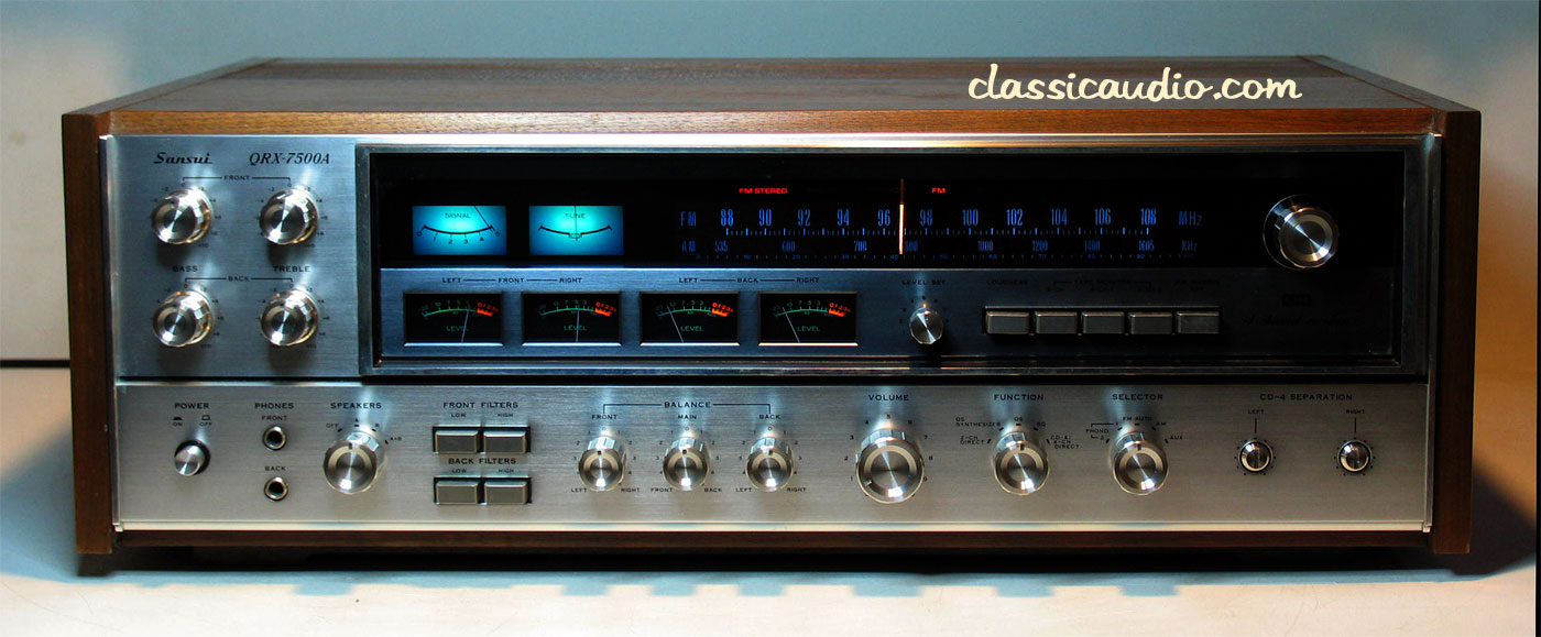 Sansui model QRX-7500A 4-channel receiver in excellent condition. Aquired from the original owner. Top of the line for this series, rated at 35 watts RMS per channel times four. Features a built in CD-4 decoder, SQ decoder (phase matrix), QS decoder (regular matrix), two phono inputs, and outputs for two sets of four speakers (that's EIGHT speakers total!). It has been serviced. Includes our original Performance Verification Report.