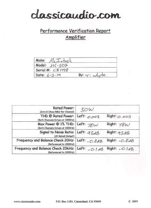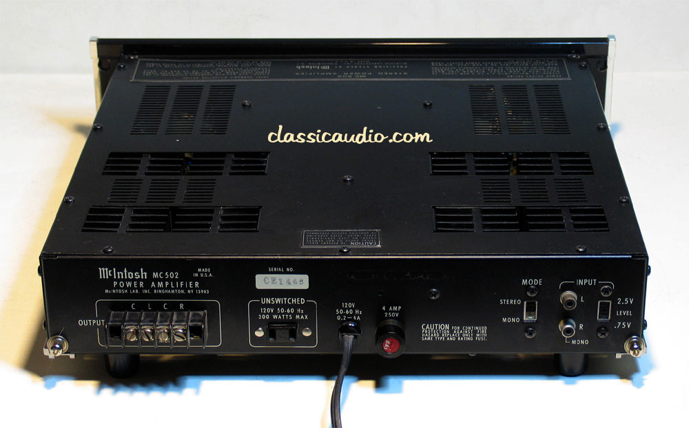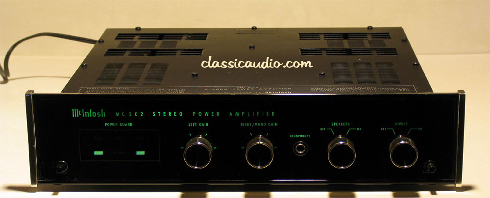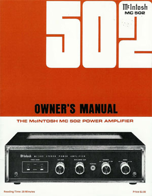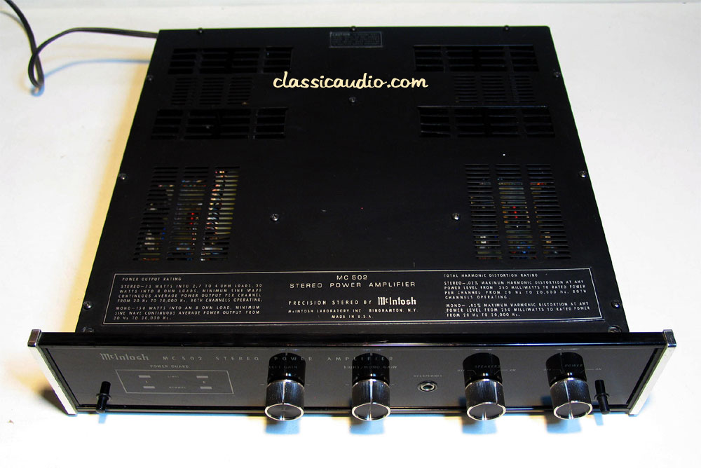 The McIntosh MC 502 power amplifier is probably the most compact source of very low distortion stereophonic power in existence. It is truly unique. More than any other amplifier it provides very low distortion stereo power, more sophisticated yet practical protection, and more bandwidth in a amazingly small yet reliable package. For example; the MC 502 weighs only 27 pounds yet it can deliver 75 watts per channel into 2.7 to 4 ohms loudspeakers, sine wave, continuous average power at less than 0.02% distortion, harmonic or intermodulation from 20 Hz to 20 kHz.
