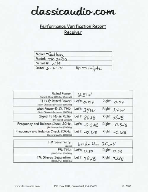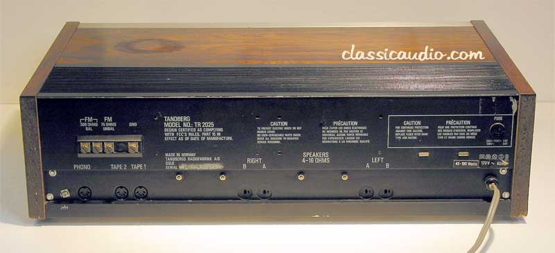 Tandberg model TR-2025 FM Stereo receiver in very good condition. Rated at 25 watts RMS per channel into 8 ohms and 40 watts RMS per channel into 4 ohms. This unit has been serviced and aligned. Includes our original Performance Verification Report. Also included are two DIN speaker connectors with screw terminals and one DIN to RCA cable for the tape monitor I/O. There is a ring shaped stain on the top cover. Please see pictures below.