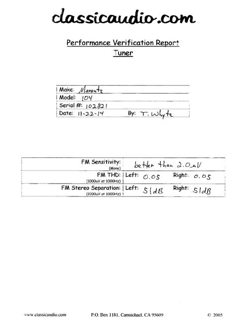 Marantz 104 AM/FM Stereo tuner in excellent condition. It has been serviced and aligned. Our original Performance Verification Report included as well as a copy of the owner's manual.