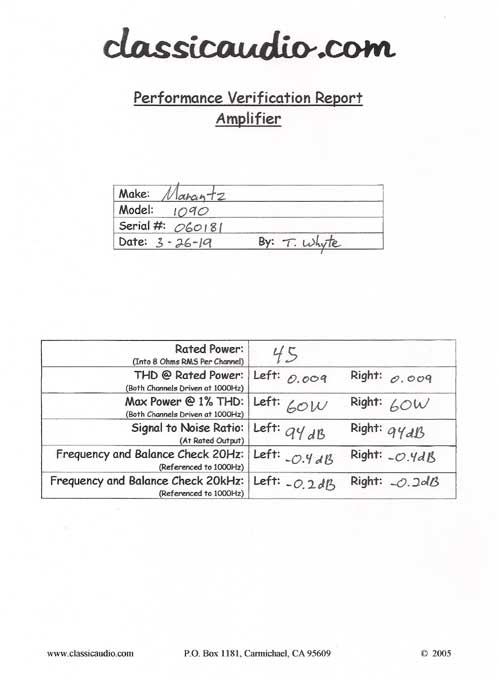 Marantz model 1090 integrated amplifier in very good condition. Rated at 45 watts RMS per channel into 8 ohms. This unit has been serviced and fully tested. Our original Performance Verification Report and a copy of the owner's manual included.