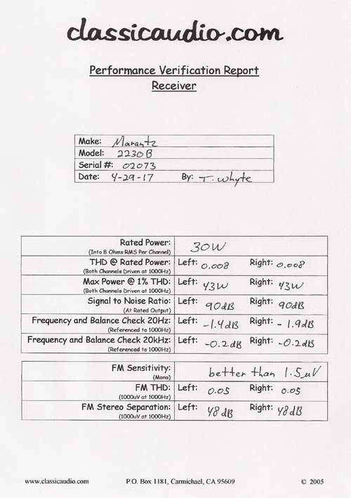 Marantz 2230B receiver in very good condition. Rated at 30 watts RMS per channel into 8 ohms. It has been serviced and aligned. Our original Performance Verification Report included.