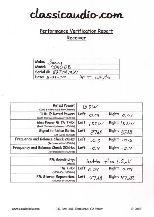 Sansui model 9090DB receiver from August of 1977 in excellent condition. Top of the line "black out" dial series. All lettering is perfect. Rated at 125 watts RMS per channel into 8 ohms. It has been serviced and aligned. Our original Performance Verification Report and a copy of the owner's manual included.